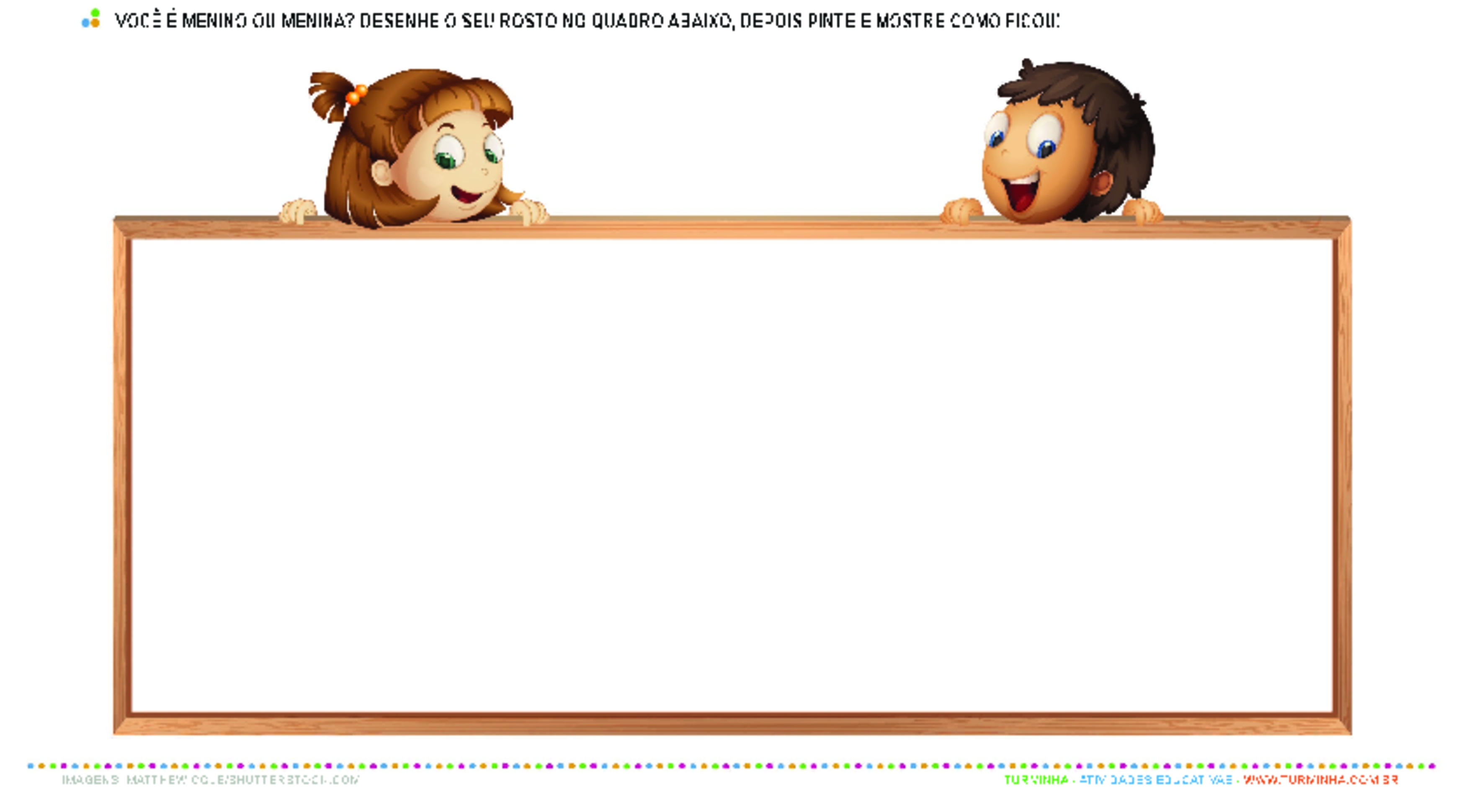 - Apresente aos alunos a atividade proposta na ficha: "Você é menino ou menina? Desenhe o seu rosto no quadro." Oriente as crianças a desenhar o próprio rosto no quadro indicado na atividade, depois peça que pinte o desenho e mostre como ficou. Nesse momento, você deve questionar as crianças sobre o que deverá ser representado, por exemplo: "o que tem no rosto?", "não esqueçam de desenhar o cabelo!".