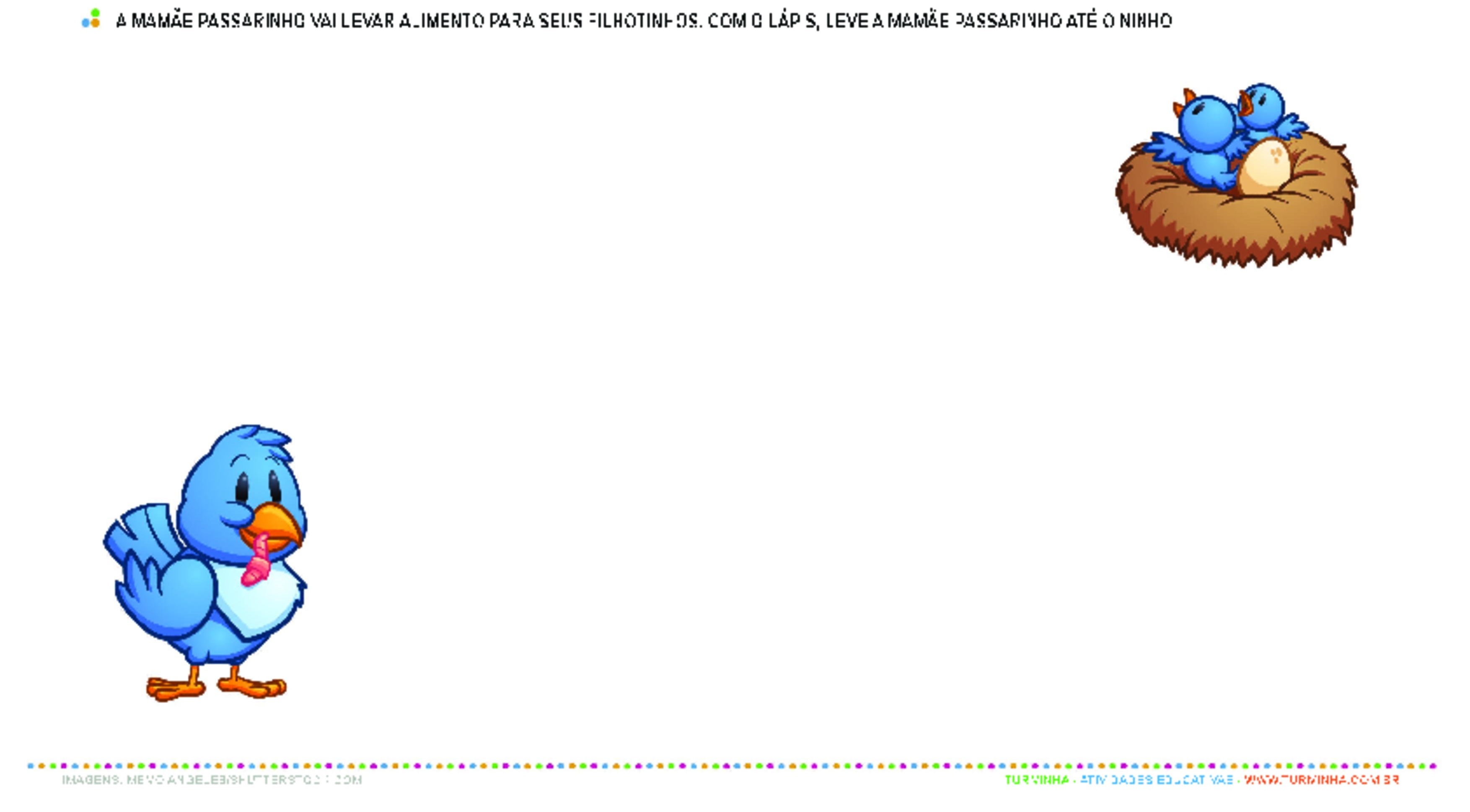- Proponha às crianças a atividade da ficha. Converse com elas e diga que a mamãe passarinho precisa alimentar seus filhotes, por isso precisamos levá-la até o ninho.